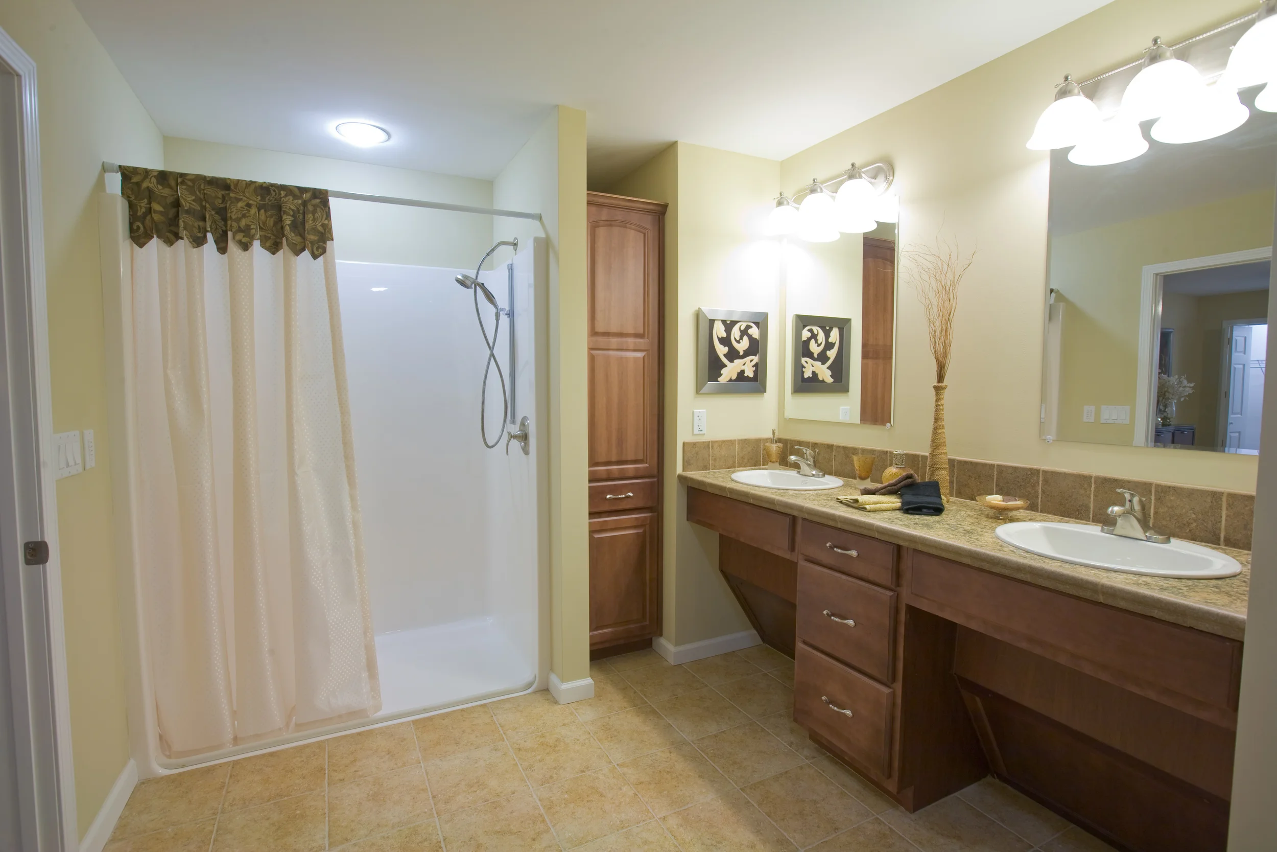 Provide a 60” diameter clear turnaround in all bathrooms, kitchen, and laundry. Provide an open area under sink with removable modesty panel to conceal plumbing lines. If not, insulate wrap hot water and drain pipes. Provide 29” minimum clear height, 30” clear width, and 19” clear depth access underneath sink. Select easy-to-clean non-slip flooring. Ceramic or porcelain tile flooring looks great…but is “mold-prone”, and can cause serious injury if you trip and fall! This also applies to the shower base or shower pan.